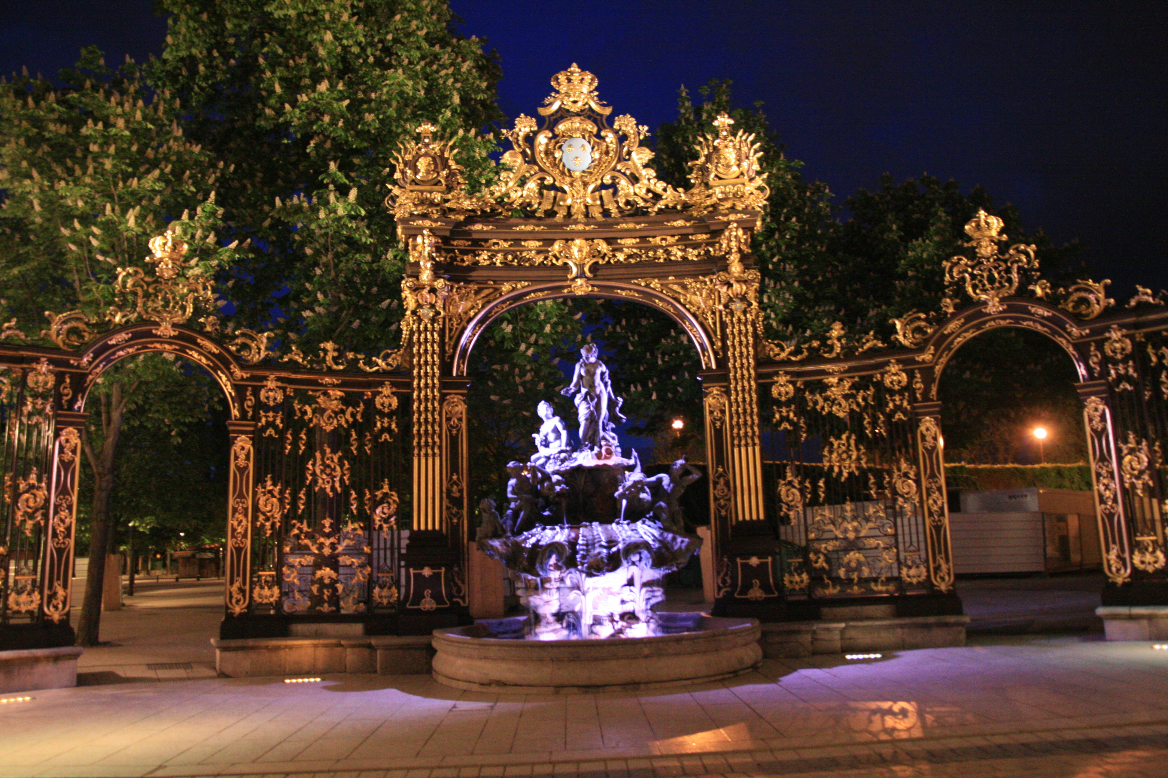 Place Stanislas, NancyOn our way home, we stopped at Nancy. The Place Stanislas with its beautifully proportioned buildings and Art Nouveau style gilded iron gates were truly majestic in moonlight and worth a visit.