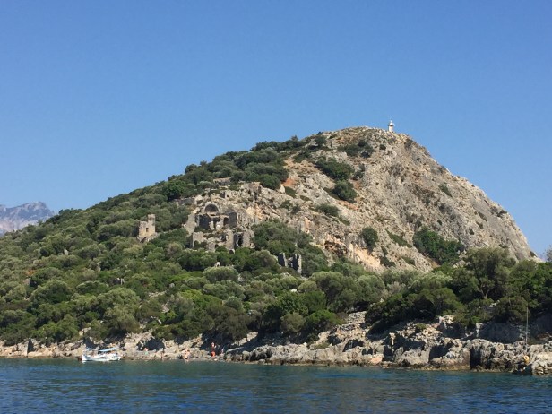 And there’s the Isle of Gemiler. It’s a small narrow island around 250 meters from the mainland, forming a seaway of around half a mile. It’s blue waters are deep and shores rocky and especially the island side provides good anchorage. Here you can put down your anchor at 30 meters and tie the shorelines to ruins of the buildings on the island.