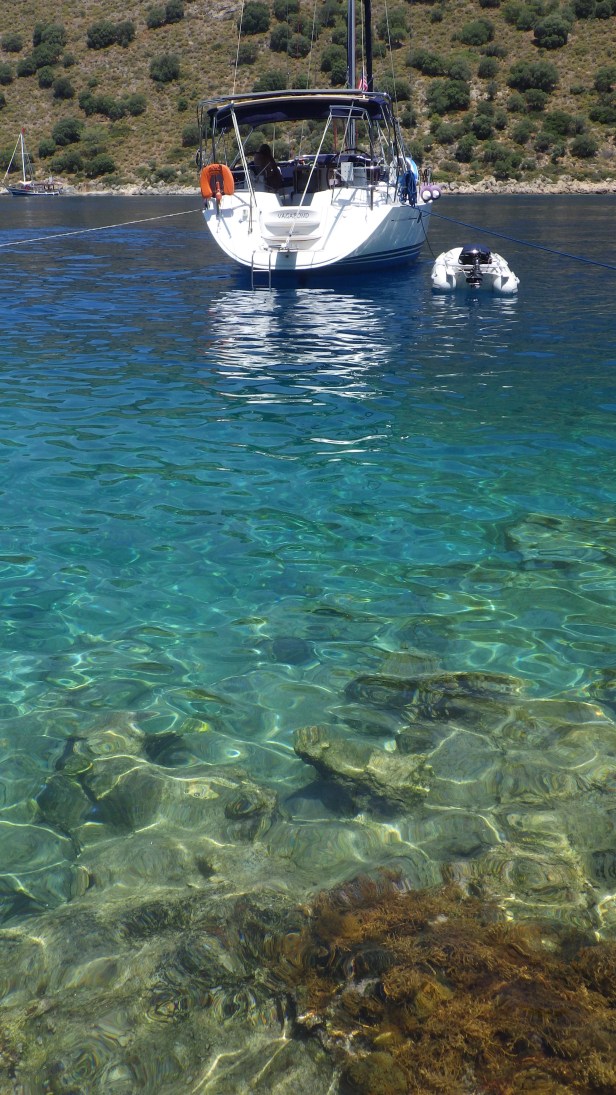 Another favourite is Karacaören, about 10 nm to the south and almost a world apart. It’s basically a largish bay surrounded by some very dangerous looking rock formations and a small island. Both the rocks and the island protect the bay and provide good anchorage. There are many moorings thanks to the courtesy of the restaurant. On the little island and at the end of the bay one notices ruins of buildings and high walls. In fact Karacaören was protecting the northern seaways of the town built on Isle of Gemiler, around one mile away.