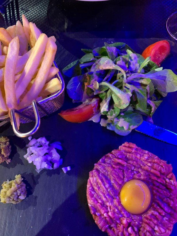 I was feeling slightly less adventurous so opted for a Tartare de Boeuf which came as ‘Le Classic’ in other words, undone. The chef just put the minced meat, egg yolk, a bit of chopped onions and capari on a plate and served them to me. Luckily I’m not a novice on classic French cuisine , so I mixed all the ingredients with gusto and had a lovely dinner.