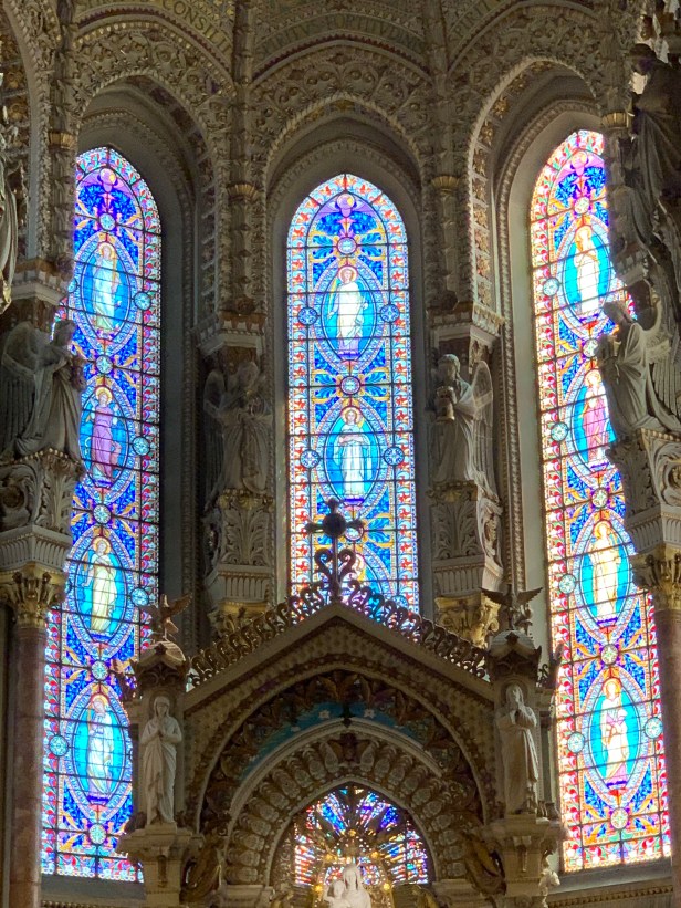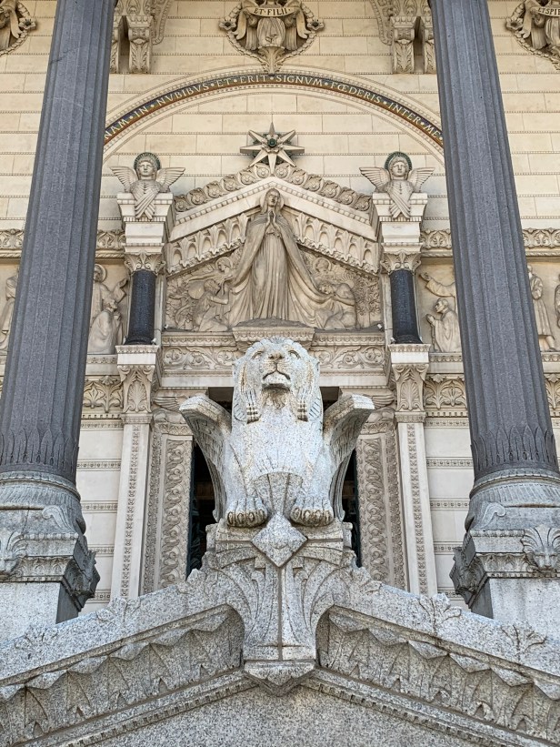 The basilica is dedicated to Virgin Mary who saved the city from cholera twice and prevented the Prussian invasion once. I guess she was elsewhere occupied during the Nazi occupation. Nowadays she sits upon the bell-tower of the Fourvière and continues to ward off any and all evil from Lyon. A very busy lady.