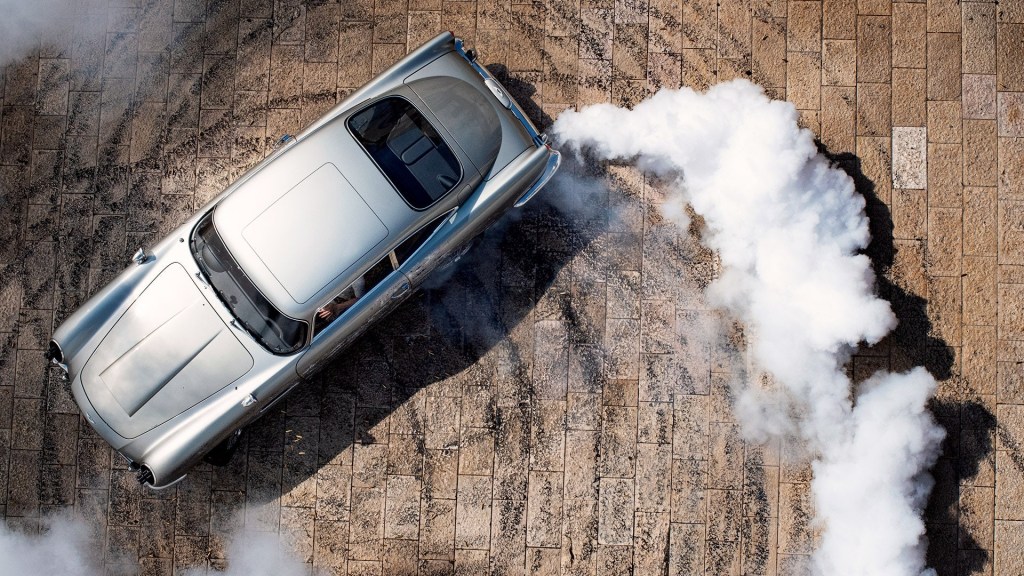 It’s obviously not its official name, but it describes what Bond does in his Aston Martin DB5 moments after being cornered by a phalanx of bad guys. We watch them spray 007 with gunfire in a relentless fusillade. His reply is authentically, deeply Bond. He waits and waits and waits, shrugs and then starts his doughnut routine, turning his car into a war machine.