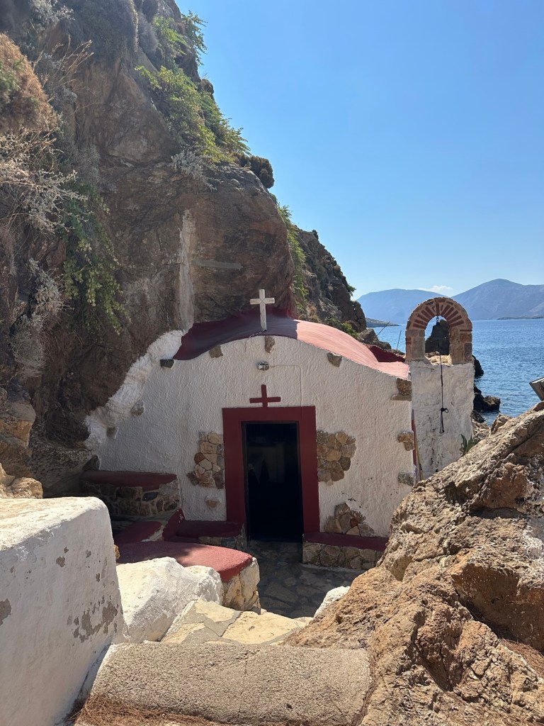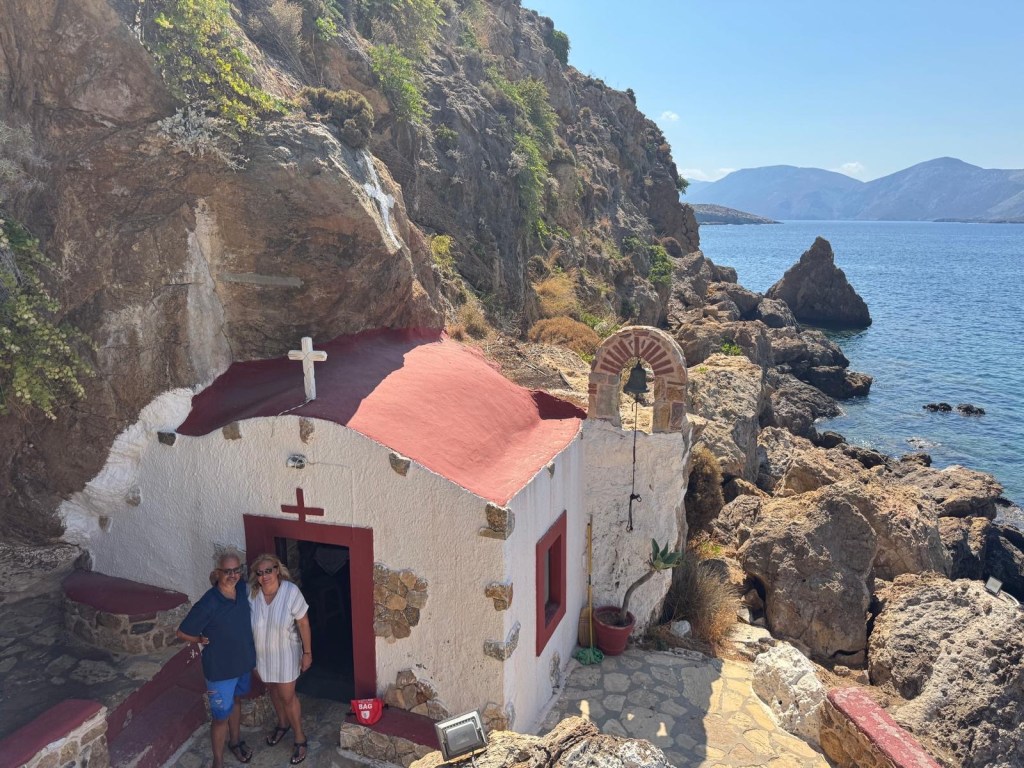 At the entrance to the bay is a tiny whitewashed chapel, tucked into a rocky cleft—Panagia Kavouradaina, “Our Lady of the Crabs.” You can hike to it from the village, or—like us—edge your dinghy into a narrow opening by the rocks and climb up.
