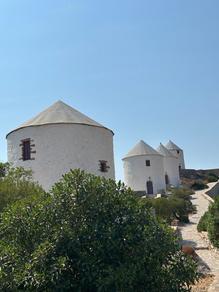 On the way down, the restored windmills came into view—iconic, glowing in the sun like something from a postcard. Right nearby is Harris, maybe the best bar in the Dodecanese, the perfect spot for a sundowner with killer views and cocktails.
