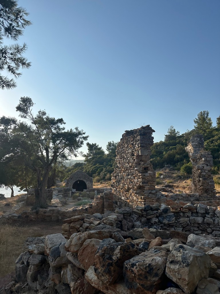 It seems the site’s story stretches from the 7th century BCE to the 7th century AD. Long before Byzantines built their harbour town, the place was settled by the Lelegians, an Anatolian tribe remembered more in myth than in fact. Homer himself names them in the Iliad, fighting on the Trojan side. Archaeologists have traced their presence here in the double walls of the acropolis above the bay.