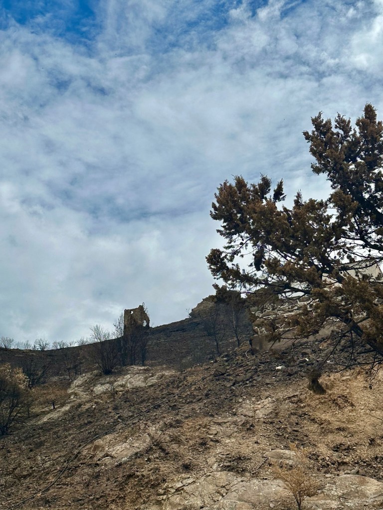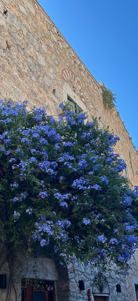 Our first stop was Volissos, a hilltop village of narrow lanes and a crumbling Byzantine tower from the 11th century. The wildfires of June and August had left their mark: blackened hillsides, the scent of ash still lingering. The tower though was something out of Game of Thrones; after a few visits from the dragons. The buildings close to the castle were damaged, but here and there, we saw some buildings escaped from the flames.