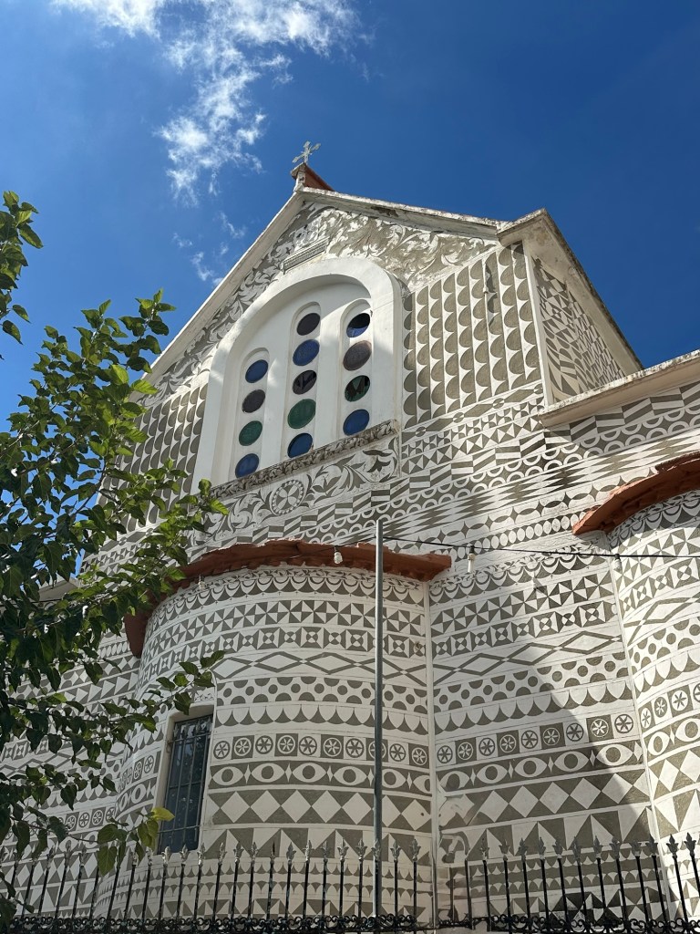 Pyrgi, known as the “painted village,” is perhaps the most photogenic . Its black-and-white geometric façades — xysta — are created by scratching patterns into layers of plaster to reveal dark volcanic sand beneath. Circles, diamonds, and flowers repeat across entire streets, turning the village into an open-air exhibition— a blend of Byzantine, Genoese, and local creativity.